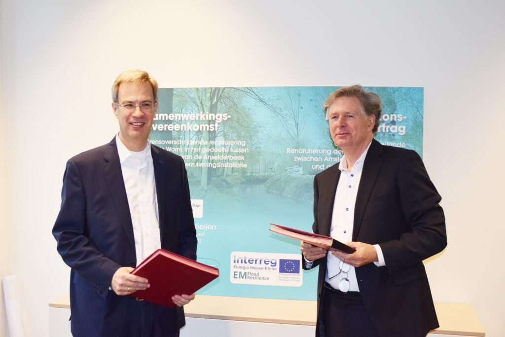 Der Wasserverband Eifel-Rur, vertreten durch den ständigen Vertreter des Vorstands, Stefan Ruchay, und die Waterschap Limburg, vertreten durch ihren Deichgrafen Lambert Verheijen, haben in Roermond am Standort der Waterschap eine Kooperationsvereinbarung über einen Abschnitt der Wurm unterzeichnet. Das Abkommen beinhaltet Vereinbarungen über die natürliche Umgestaltung eines Teils des Flusses, genauer gesagt des Abschnitts zwischen der Amstelbach-Einmündung und der Kläranlage bei Rimburg. Es ist das erste Mal, dass die beiden Organisationen auf diese Weise zusammenarbeiten.