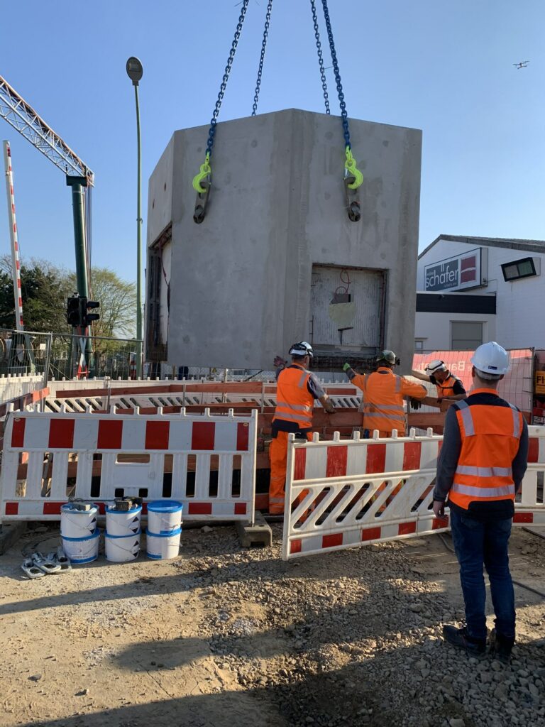 Das Schachtbauwerk wird in die Baugrube Ecke Renkerstr./Gerhard-Fuß-Str. eingesetzt.