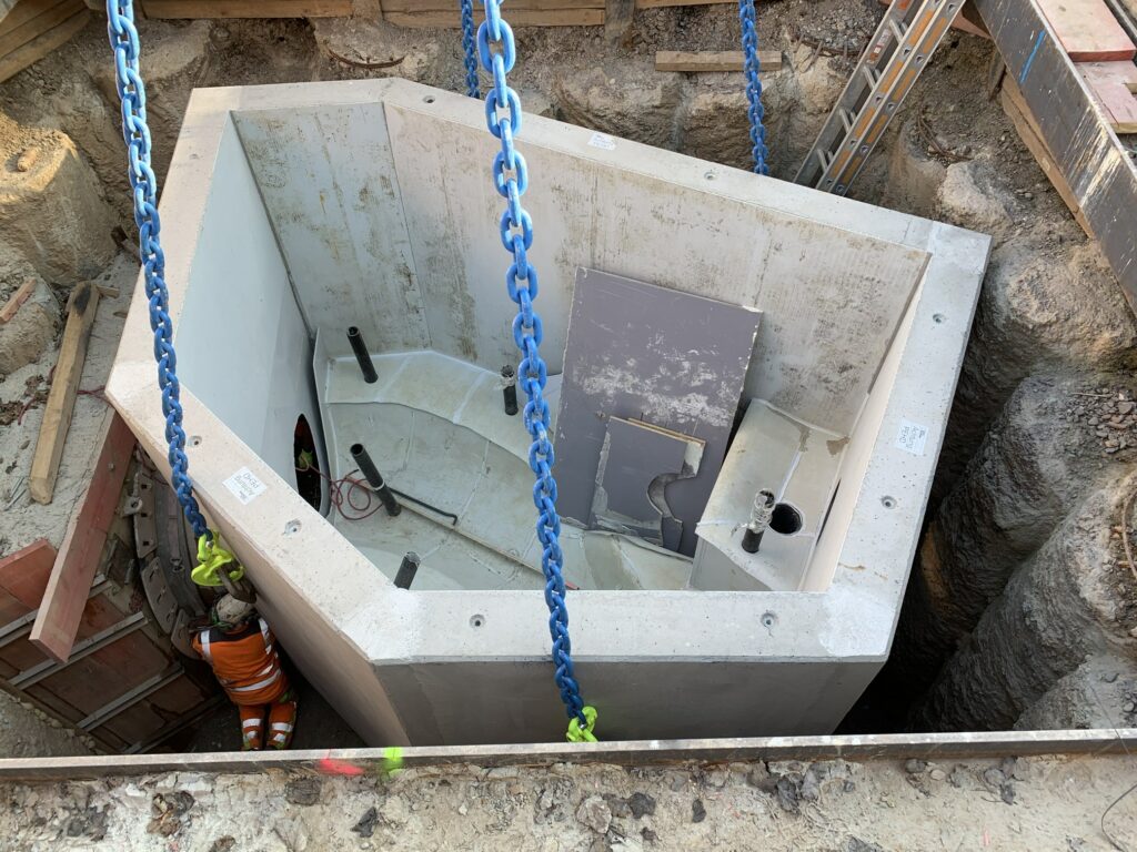 Das Schachtbauwerk ist in der Baugrube positioniert und wird in der Folge mit den Kanalenden verbunden.