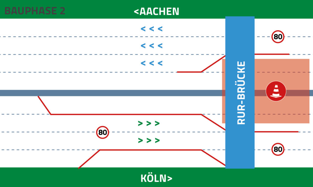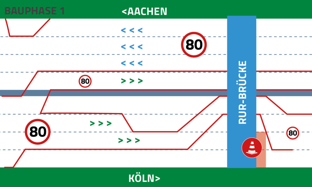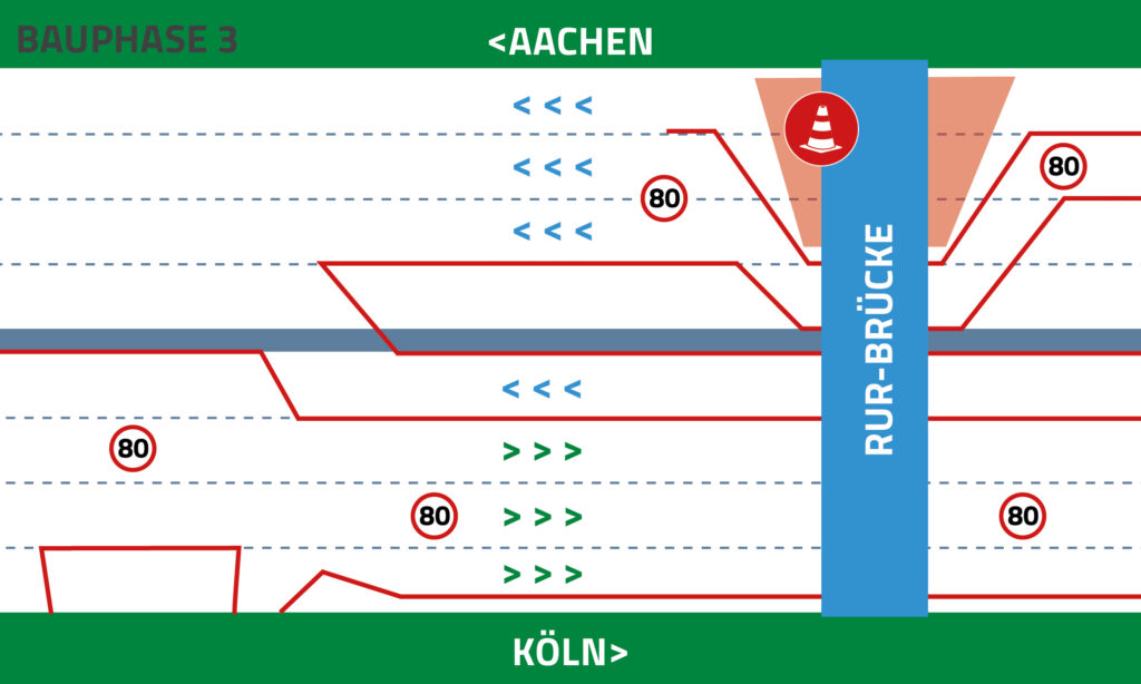 Die Bauarbeiten erfordern ein offenes Bauverfahren: Dies führt im Zeitraum vom 05.06.2023 bis voraussichtlich zum 14.08.2023 zu einer geänderten Verkehrsführung sowie Geschwindigkeitsbegrenzungen auf der A4. Betroffen ist der Abschnitt zwischen dem Rastplatz „Rur Scholle Nord bzw. Süd“ und der Anschlussstelle Düren.