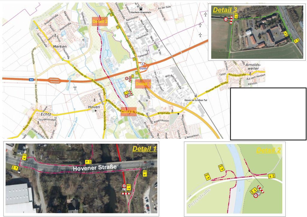 Da auch Arbeiten unterhalb der Brücke stattfinden, wird der flussabwärts rechtsseitige Rur-Uferradweg zwischen der „Hovener Straße“ (zwischen Birkesdorf und Hoven im Süden) und der Rurbrücke „Peterstraße“ (bei Merken im Norden) auf den Uferradweg auf der linken Flussseite umgeleitet. Die Umleitung beginnt am 01.06.2023 und endet voraussichtlich am 15.09.2023.