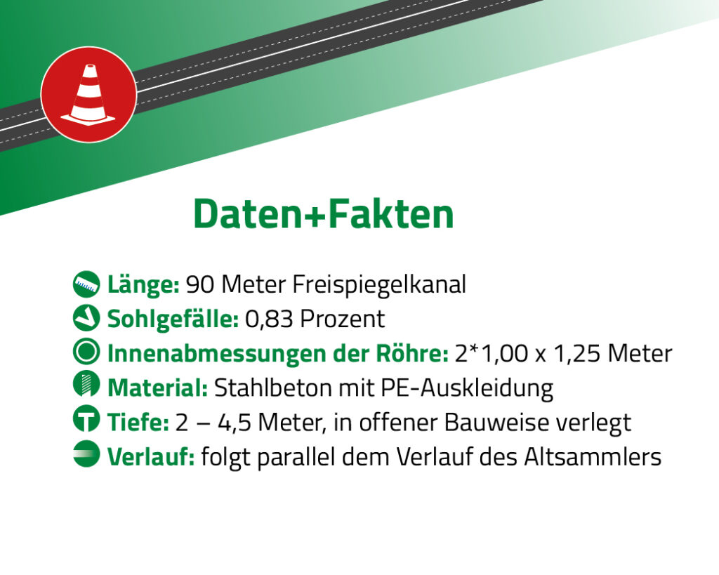 Aufgrund der örtlichen Gegebenheiten ist der Neubau eines Doppelrohrs im Bereich Süd nicht möglich, daher wird es in diesem Bereich zwei Kanalstränge geben, HS 10 (Neubau) und HS 11 (Bestandskanal).