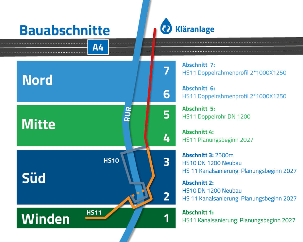 Der Bau des Parallelsammlers ist in drei Abschnitte eingeteilt: Im Bereich „Süd“ wird er von Kreuzau bis nach Lendersdorf als Parallelsammler HS10 verlegt. In den Bauabschnitten „Mitte“ – Innenstadt Düren – und „Nord“ – durch den Josef-Vosen-Park, an der Rur entlang bis zur Kläranlage – ersetzt er als HS11, so das Kürzel, den bestehenden Solokanal durch eine Doppelröhre.