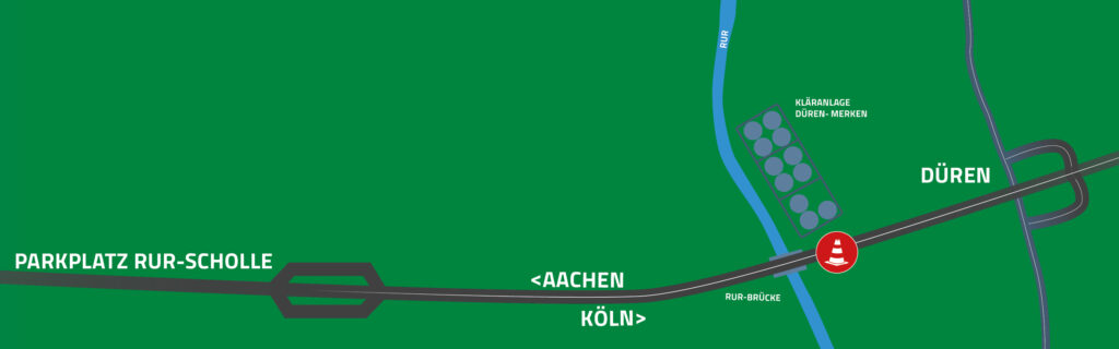 Um die Kläranlage Düren-Merken zu erreichen, muss der neue Hauptsammler die Autobahn A4 queren. Dies geschieht auf Höhe der Rur-Brücke und ist aus planerischen Aspekten der Startschuss für das Großbauprojekt. Auch die Kläranlage wird derzeit erweitert und saniert.