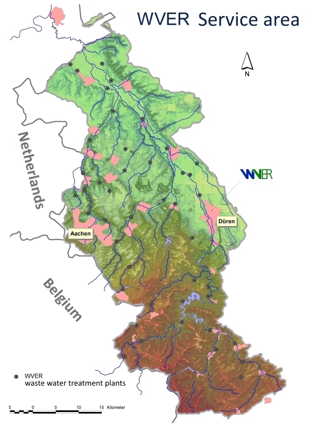 The service area of WVER comprises the above-ground Rur catchment area in the State of Northrhine-Westphalia in Germany. It stretches from Heinsberg in the north to Hellenthal in the south and from Aachen in the west to Düren in the east. Some 1.1 million inhabitants live in the 2,087 sq. km. area.