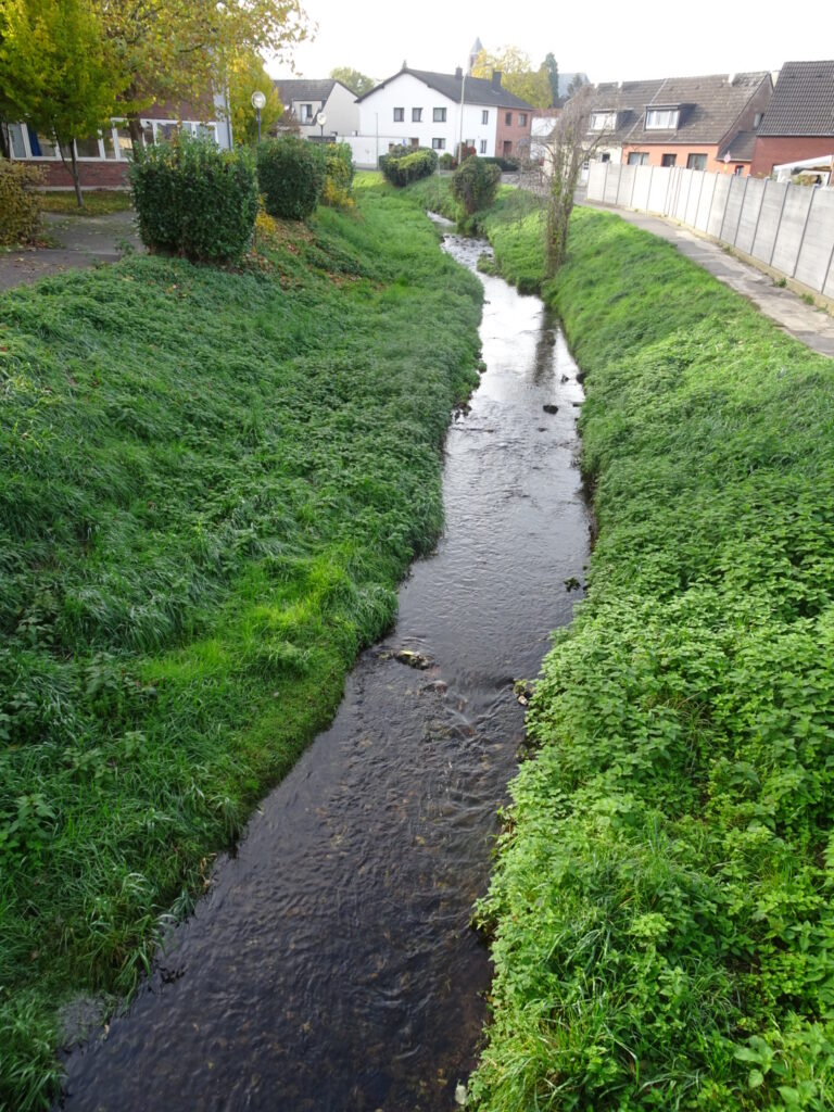 Der Wehebach fließt in Langerwehe zwischen Hauptstraße und Europaschule noch in einem unnatürlichen Trapezprofil mit steilen Uferböschungen.