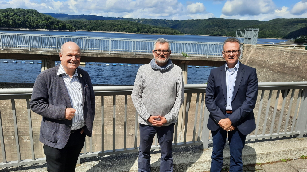Die zurückliegenden Hochwasserereignisse erfordern Verbesserungen der bestehenden Schutzstrukturen, aber auch neue Ideen und Initiativen. Zu einem Austausch darüber trafen sich an der Rurtalsperre Schwammenauel der SPD-Bundestagsabgeordnete Dietmar Nietan aus Düren, der Verbandsratsvorsitzende des Wasserverbands Eifel-Rur (WVER), Frank Peter Ullrich, Bürgermeister der Stadt Düren, und Verbandsvorstand Dr. Joachim Reichert.